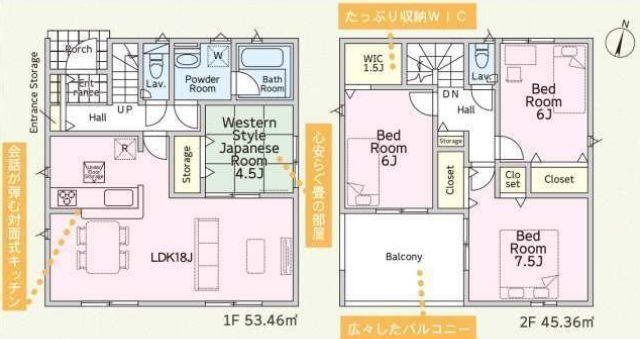部屋 | 1F LDK 18.0帖 、2F 洋 7.5帖 、2F 洋 6.0帖 、2F 洋 6.0帖 、1F 和 4.5帖 |