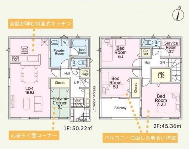 部屋 | 1F LDK 16.5帖 、2F 洋 7.2帖 、2F 洋 6.0帖 、2F 洋 5.0帖 、2F S(納戸) 2.0帖 、1F 和 3.0帖 |
