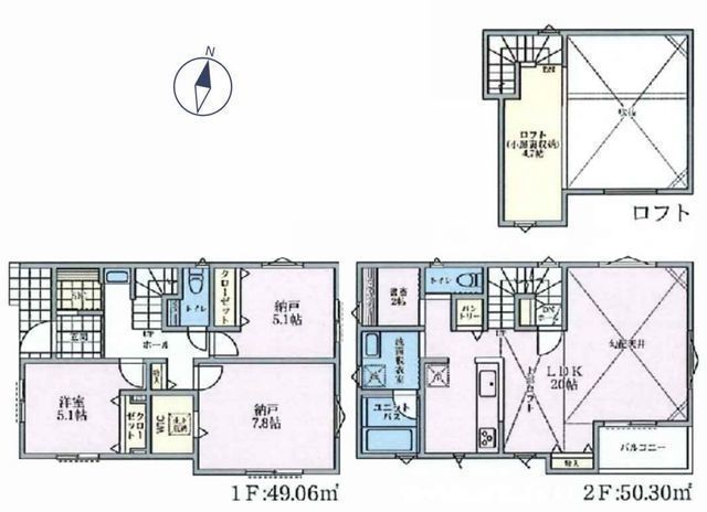 | 部屋 | 2F LDK 20.0帖 、1F 洋 5.1帖 、1F S(納戸) 7.8帖 、1F S(納戸) 5.1帖 、その他 4.7帖 |