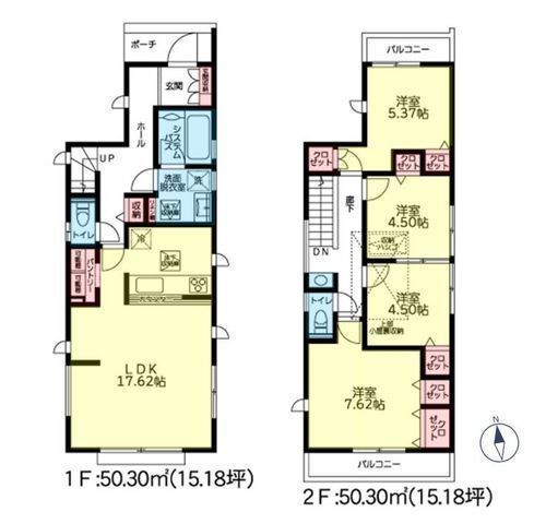 | 部屋 | 1F LDK 17.6帖 、2F 洋 7.6帖 、2F 洋 5.3帖 、2F 洋 4.5帖 、2F 洋 4.5帖 |