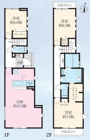 部屋 | 1F LDK 17.5帖 、1F 洋 6.0帖 、2F 洋 7.5帖 、2F 洋 6.5帖 |