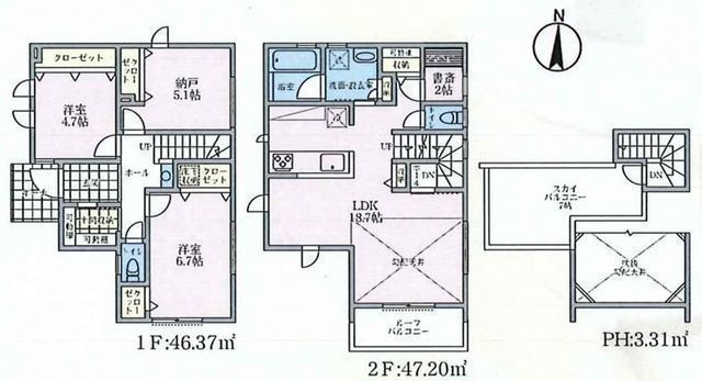 | 部屋 | 2F LDK 18.7帖 、1F 洋 6.7帖 、1F 洋 5.1帖 、1F 洋 4.7帖 |