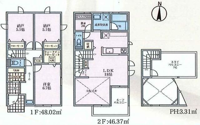 部屋 | 2F LDK 18.0帖 、1F 洋 6.7帖 、1F 洋 5.1帖 、1F 洋 5.1帖 |