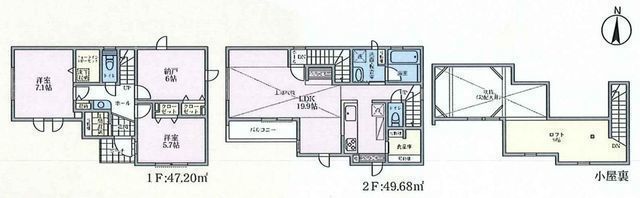 部屋 | 2F LDK 19.9帖 、1F 洋 7.1帖 、1F 洋 6.0帖 、1F 洋 5.7帖 |