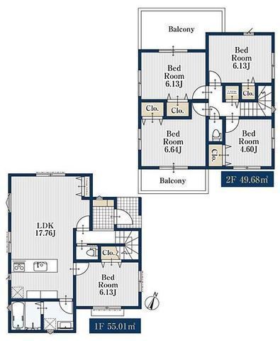 | 部屋 | 1F LDK 17.7帖 、1F 洋 6.1帖 、2F 洋 6.6帖 、2F 洋 6.1帖 、2F 洋 6.1帖 、2F 洋 4.6帖 |