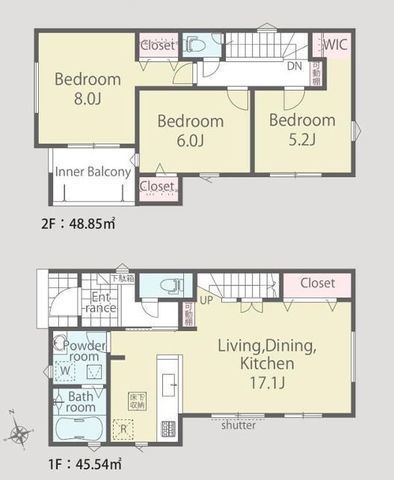 | 部屋 | 1F LDK 17.1帖 、2F 洋 8.0帖 、2F 洋 6.0帖 、2F 洋 5.2帖 |