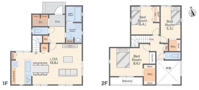 | 部屋 | 1F LDK 18.8帖 、2F 洋 8.6帖 、2F 洋 5.4帖 、2F 洋 5.3帖 |