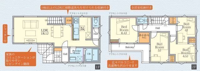 | 部屋 | 1F LDK 18.1帖 、2F 洋 6.4帖 、2F 洋 5.0帖 、2F 洋 4.5帖 、2F 洋 4.0帖 |