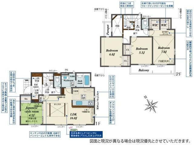 | 部屋 | 1F LDK 16.0帖 、2F 洋 7.0帖 、2F 洋 6.0帖 、2F 洋 5.5帖 、1F 和 4.5帖 |