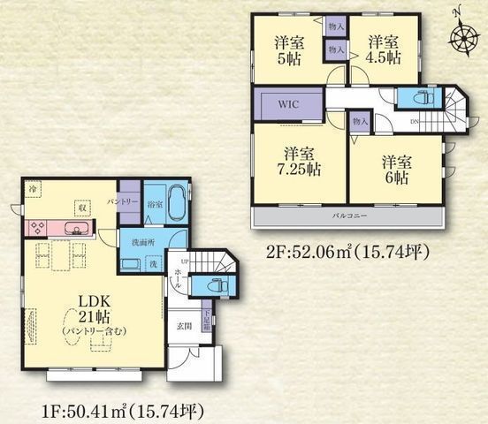 | 部屋 | 1F LDK 21.0帖 、2F 洋 7.2帖 、2F 洋 6.0帖 、2F 洋 5.0帖 、2F 洋 4.5帖 |