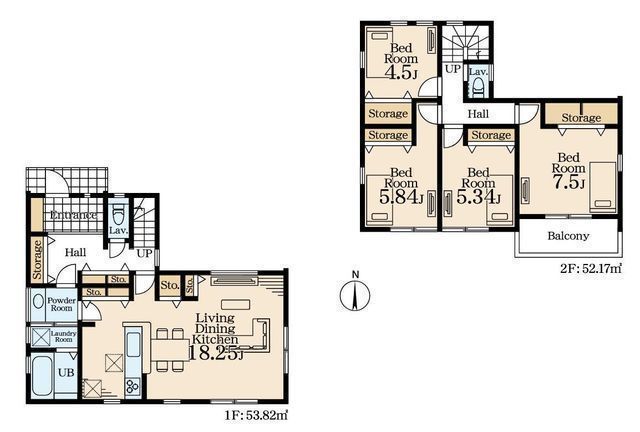 | 部屋 | 1F LDK 18.2帖 、2F 洋 7.5帖 、2F 洋 5.8帖 、2F 洋 5.3帖 、2F 洋 4.5帖 |