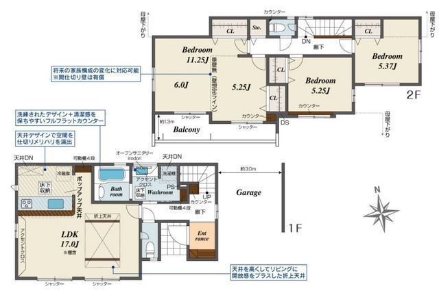 | 部屋 | 1F LDK 17.0帖 、2F 洋 11.2帖 、2F 洋 5.3帖 、2F 洋 5.2帖 |