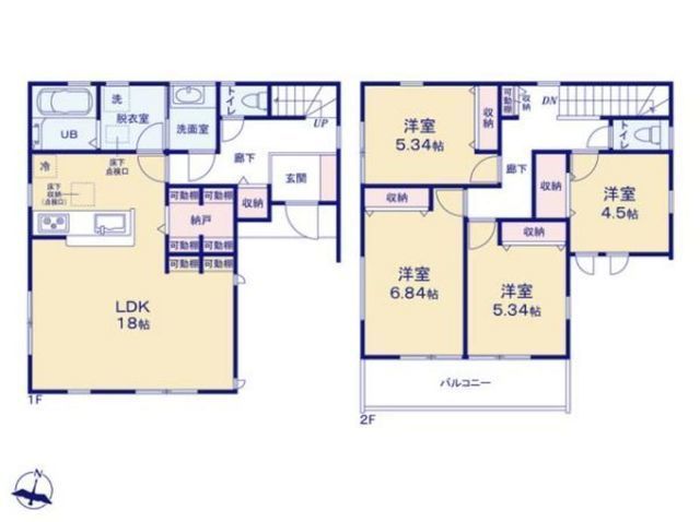 | 部屋 | 1F LDK 18.0帖 、2F 洋 6.8帖 、2F 洋 5.3帖 、2F 洋 5.3帖 、2F 洋 4.5帖 、S(納戸) |