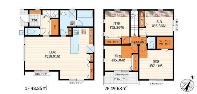 | 部屋 | 1F LDK 18.9帖 、2F 洋 7.4帖 、2F 洋 5.3帖 、2F 洋 5.3帖 、2F S(納戸) 5.3帖 |