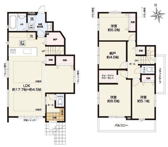 | 部屋 | 1F LDK 22.2帖 、2F 洋 8.5帖 、2F 洋 5.2帖 、2F 洋 5.1帖 、2F S(納戸) 4.5帖 |
