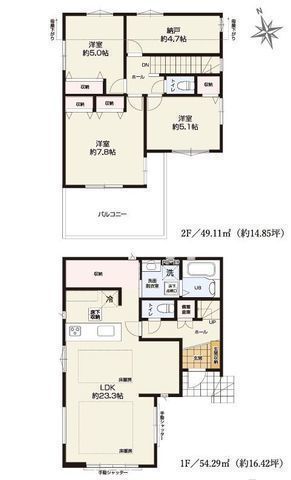 | 部屋 | 2F LDK 21.4帖 、1F 洋 8.1帖 、1F 洋 4.0帖 、1F S(納戸) 5.0帖 、1F S(納戸) 5.0帖 |