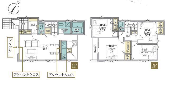 | 部屋 | 1F LDK 18.0帖 、2F 洋 7.0帖 、2F 洋 5.2帖 、2F 洋 5.2帖 、2F 洋 5.2帖 |