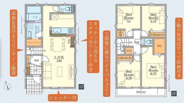 | 部屋 | 1F LDK 19.0帖 、2F 洋 6.7帖 、2F 洋 5.2帖 、2F 洋 5.2帖 、2F 洋 5.0帖 |