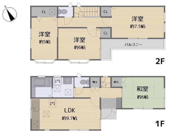 | 部屋 | 1F LDK 9.7帖 、2F 洋 7.5帖 、2F 洋 6.0帖 、2F 洋 5.0帖 、1F 和 6.0帖 |