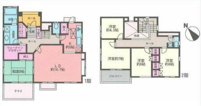 | 部屋 | 1F LDK 19.7帖 、2F 洋 7.0帖 、2F 洋 6.0帖 、2F 洋 6.0帖 、2F 洋 4.5帖 、1F 和 6.0帖 |