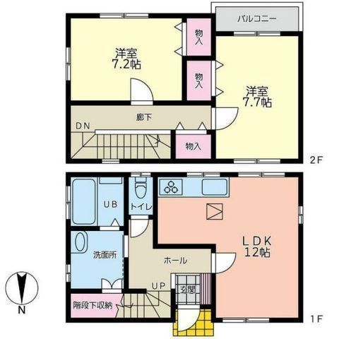 | 部屋 | 1F LDK 12.0帖 、2F 洋 7.7帖 、2F 洋 7.2帖 |