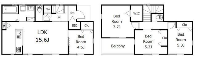 | 部屋 | 1F LDK 15.6帖 、1F 洋 4.5帖 、2F 洋 7.7帖 、2F 洋 5.3帖 、2F 洋 5.3帖 |